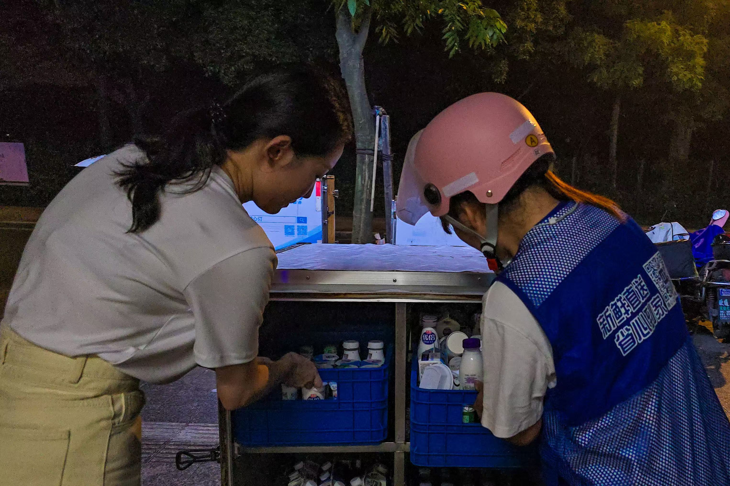 劳动报记者颜筱依(左)记录下凌晨采访送奶工这一刻。劳动报记者 颜筱依 摄影