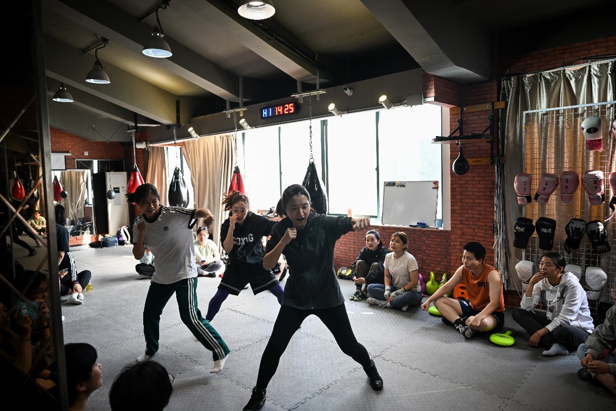 “普琳女子拳击俱乐部”是上海首家女子拳击馆,在拳馆打拳的学员中,有兼顾家庭的职场妈妈,亦有刚步入大学的“05后”女生。据门店创始人弓瑾介绍,练拳击让更多学员变得更加勇敢和自信。近一年,该店在大众点评上的“女子拳击新客体验团购”已售出200多单。