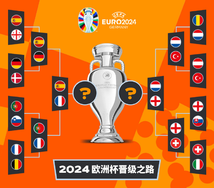 随着四强球队全部产生,本届欧洲杯的两场半决赛对阵也全部落定。北京时间7月10日和11日凌晨3时,两场比赛先后在慕尼黑和多特蒙德举行。第一场半决赛由西班牙队和法国队交手,而英格兰队将与时隔20年重返欧洲杯四强的荷兰队争夺另一个决赛席位。决赛则将在柏林举行,比赛时间是北京时间7月15日凌晨3时。