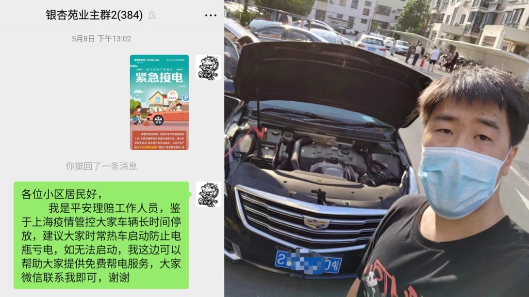 “各位邻居好,我的车亏电了,有哪位邻居知道该如何接电启动吗?”接到复工通知的张先生出门后发现自己的车辆无法启动,非常着急,正在社区群里求助。平安产险上海理赔员徐松毅看到后,立刻联系张先生,表示自己有搭电设备可以协助。随后,徐松毅来到张先生爱车附近,接好搭电设备,很快,张先生的车辆就成功接电启动。