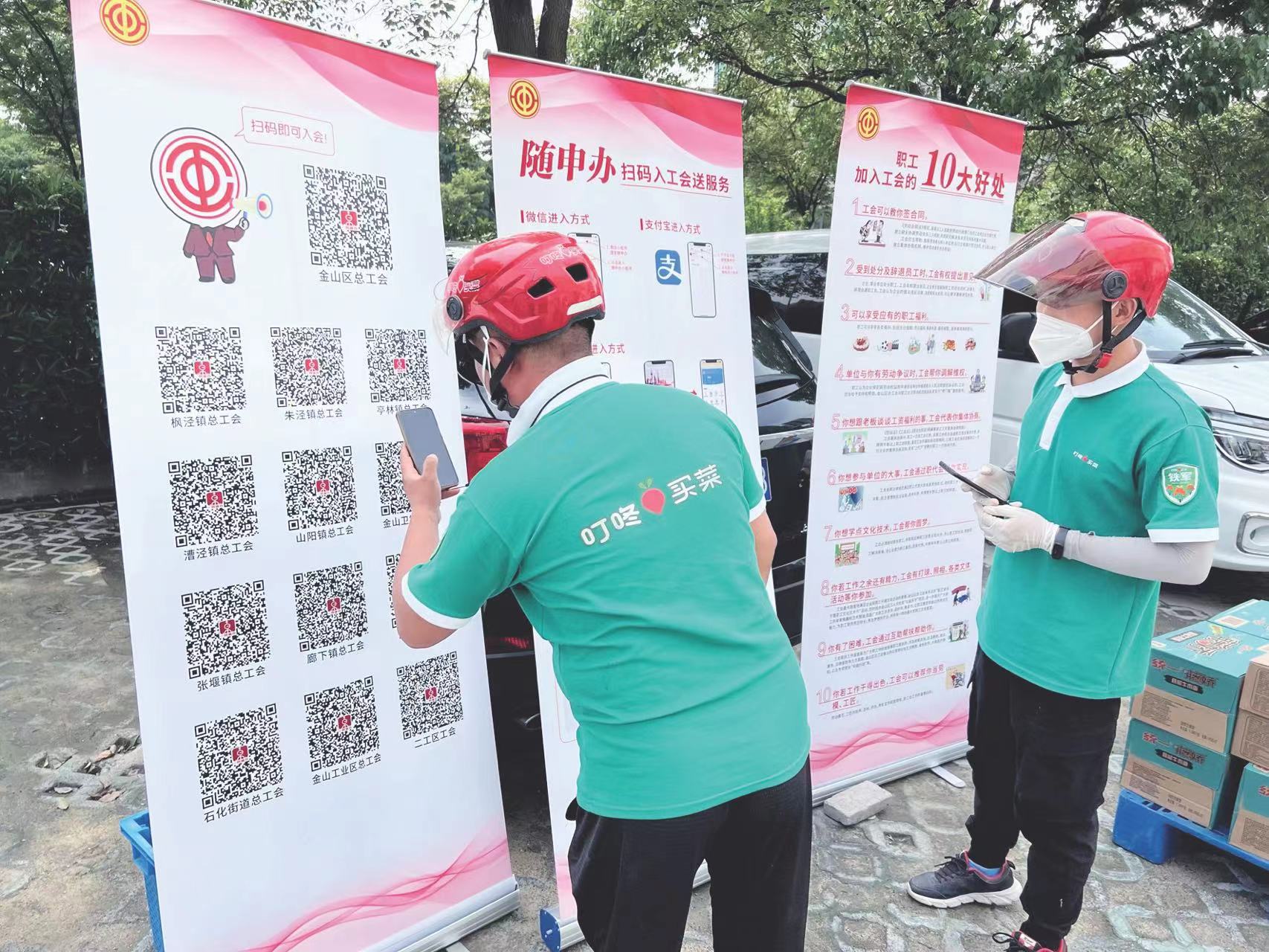 今年3月,金山区建筑行业联合工会成立大会暨第一届第一次会员代表大会召开,全区2万多名建设者有了“娘家”。各级工会扩展扫码入会工作的深度和广度,切实发挥“小二级”工会兜底作用,最大限度吸收快递员、外卖配送员等新就业形态劳动者加入工会。