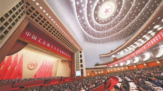 10月12日下午,中国工会第十八次全国代表大会圆满完成各项议程,在庄严的《国际歌》声中胜利闭幕。闭幕式由全国人大常委会副委员长、中华全国总工会主席王东明主持。