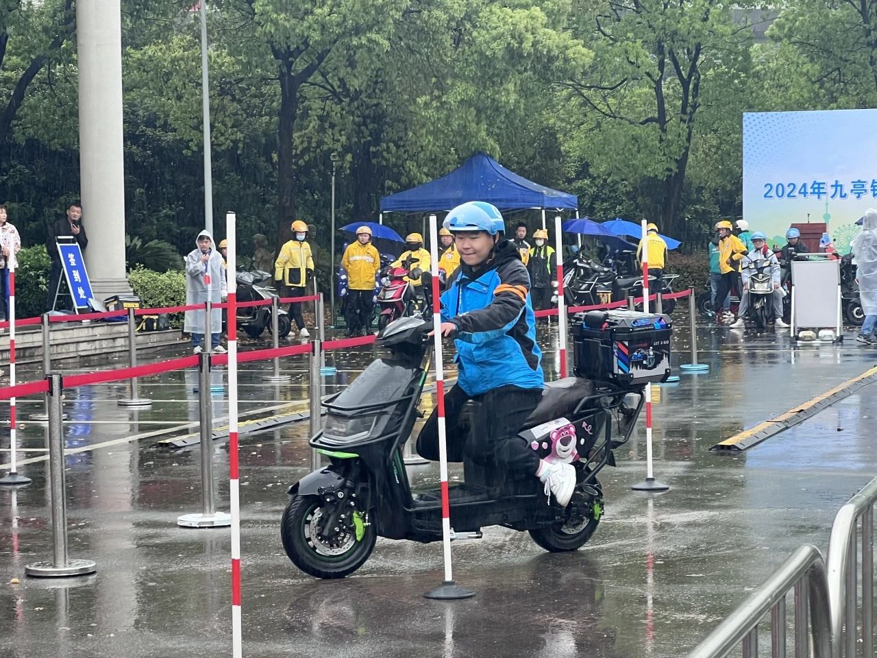 临时设置的骑行赛道上,S弯绕桩、单边桥、窄巷分类布设。雨天比赛,参赛人员热情不减。只见裁判员一声令下,骑手们三人一组,骑着电动车分道向前,依次经过各个点位。除了考查速度,如何骑得又稳又好也是评判标准。外卖员闫吉虎去年也参加了九亭镇举办的新就业形态劳动者劳动技能比赛。今年第二次参赛,他信心满满,但也作了客观分析:“下雨天路滑,难度会大很多,刚好也是考验我们的好机会。”
