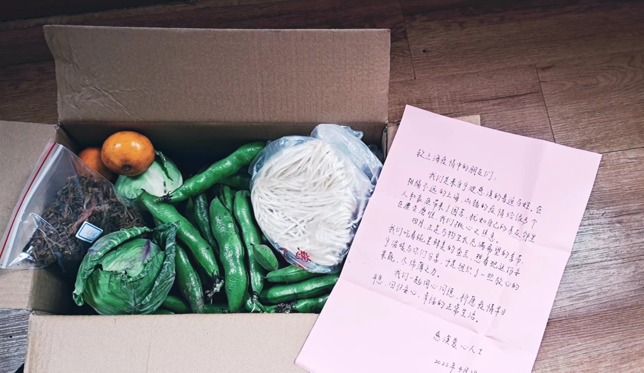 4月29日这天,她打开房门,想问问居委或者隔壁邻居,哪里可以买些物资,却发现家门口出现了一箱蔬菜,里面有新鲜采摘的蚕豆、卷心菜、橘子和一袋面条,虽然东西不多,但蔬菜新鲜翠绿。