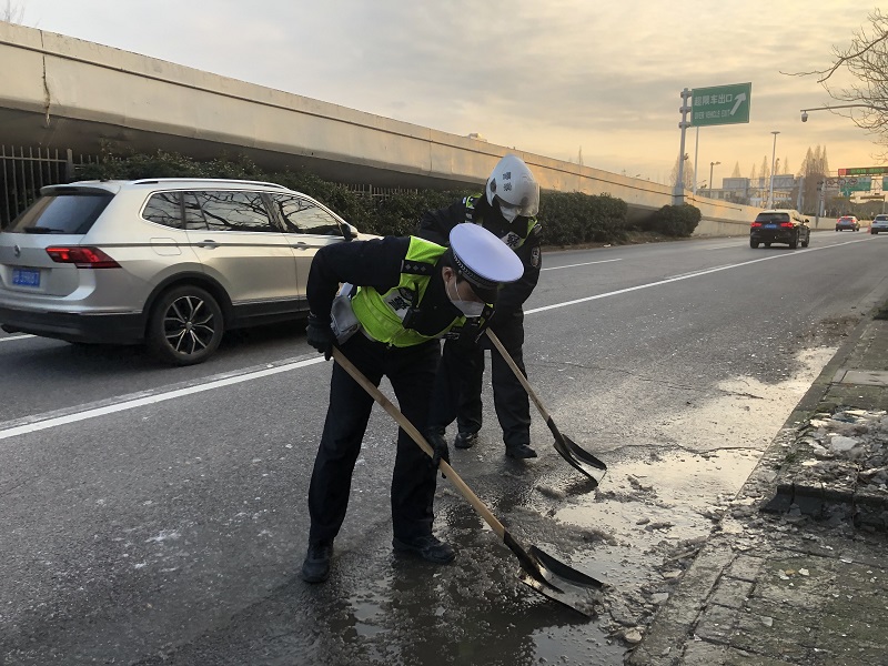 例如静安地区的大统路地道、北横通道等下立交、低洼路段,交警部门在发现有薄冰情况出现后,立刻启动预案并及时会同道路养护部门进行干预,并安排民警值守、加强道路疏导,结冰路段清理迅速。