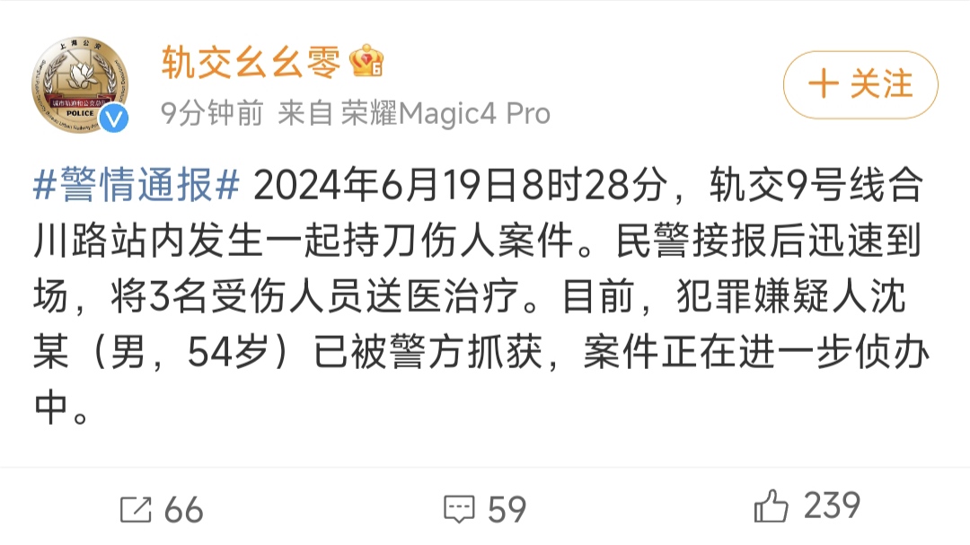 2024年6月19日8时28分,轨交9号线合川路站内发生一起持刀伤人案件。民警接报后迅速到场,将3名受伤人员送医治疗。目前,犯罪嫌疑人沈某(男,54岁)已被警方抓获,案件正在进一步侦办中。