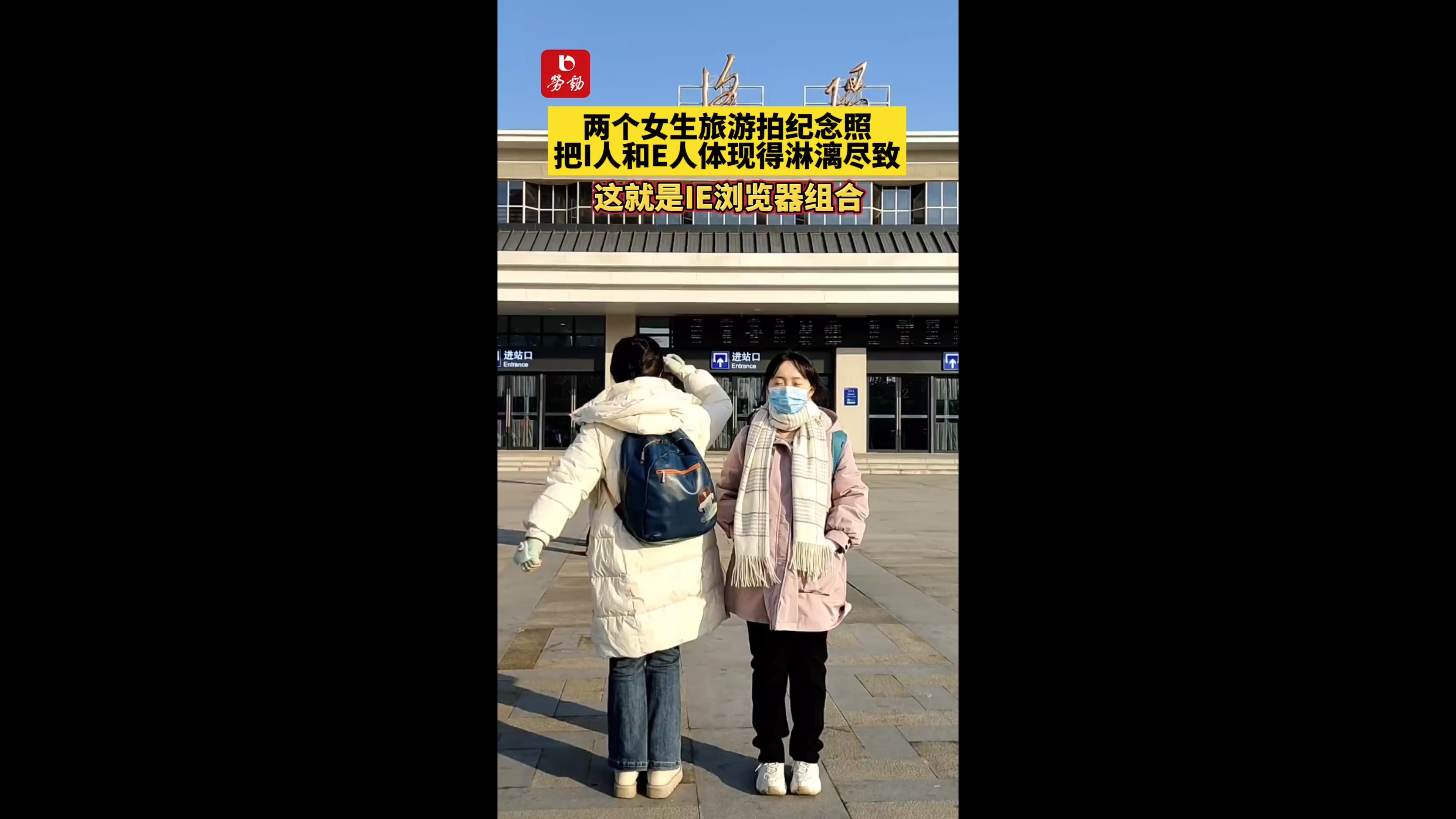 两个女生旅游拍纪念照, 把I人和E人体现的淋漓尽致。这就是IE浏览器组合。