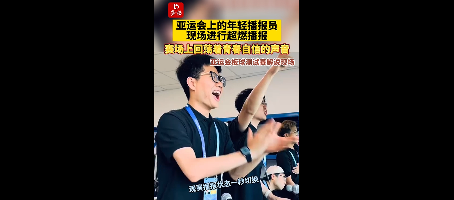 亚运会上的年轻播报员现场进行超燃播报,赛场上回荡着青春自信的声音