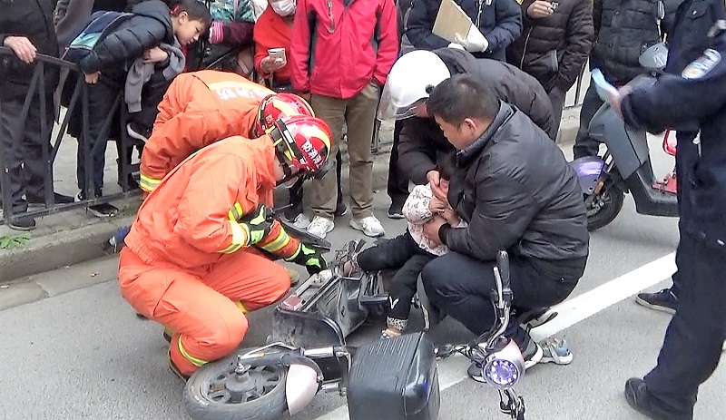 消防救援人员到场后发现,一辆电动车倒伏在路边,一名2岁半小女孩靠在家长的怀抱中,哭得声嘶力竭,小脸通红,右脚被卷入右侧电动车车架,脚踝处被牢牢卡在电动车后轮与车架的缝隙之中,动弹不得。