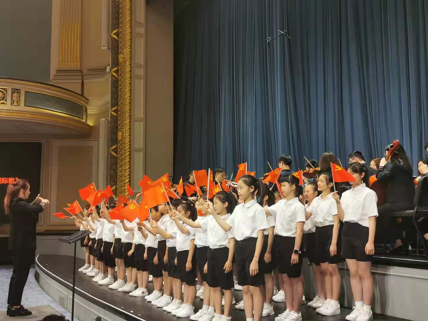 记者在现场看到,当天,上海彩虹室内乐团从音乐厅舞台幕布后缓缓走出,以一首振奋人心的《国际歌》拉开了快闪的序幕。随后,数十位小朋友组成的童声合唱团挥舞着国旗和党旗走到了台前,齐声唱起了《同一首歌》。