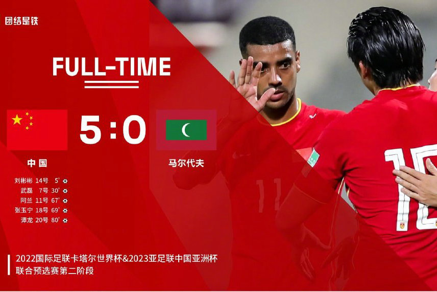 在确保必须拿分的比赛中,国足毫无悬念,取得一场大胜。北京时间6月12日凌晨,中国男足国家队以5比0大胜马尔代夫队,锁定本组第二名。而横向比较8个小组的第二名成绩,国足目前排名第二,综合各方面因素来看,国足最后一轮只需要战平叙利亚队,就可以获得出线权,甚至输球也有机会晋级12强赛。