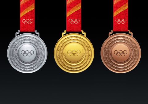北京2022年冬奥会奖牌,正面中心刻有奥林匹克五环标志,周围刻有北京2022年冬奥会英文全称(XXIV Olympic Winter Games Beijing 2022)字样。圆环做打凹处理,取意传统弦纹玉璧,上面浅刻装饰纹样,均来自中国传统纹样,其中冰雪纹表现了冬奥会的特征,祥云纹传达了吉祥的寓意。