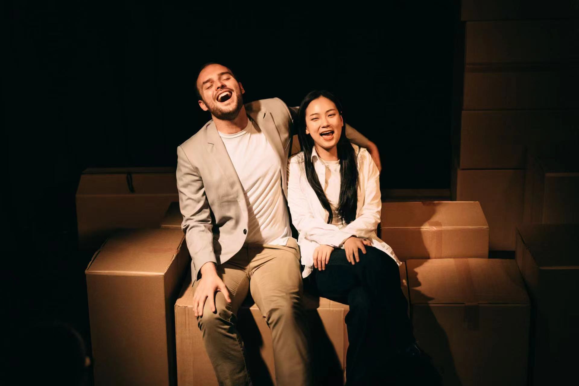 不仅如此,在舞台设计上,两位中国主创也动足了脑筋。比如以纸箱布满舞台,暗喻留学生在异国他乡随时准备搬家且难以拥有真正“家”的感受;中英双语的剧作台词,让观众更直观地感受到两种文化的差异,同时为戏剧叙事增添趣味性。