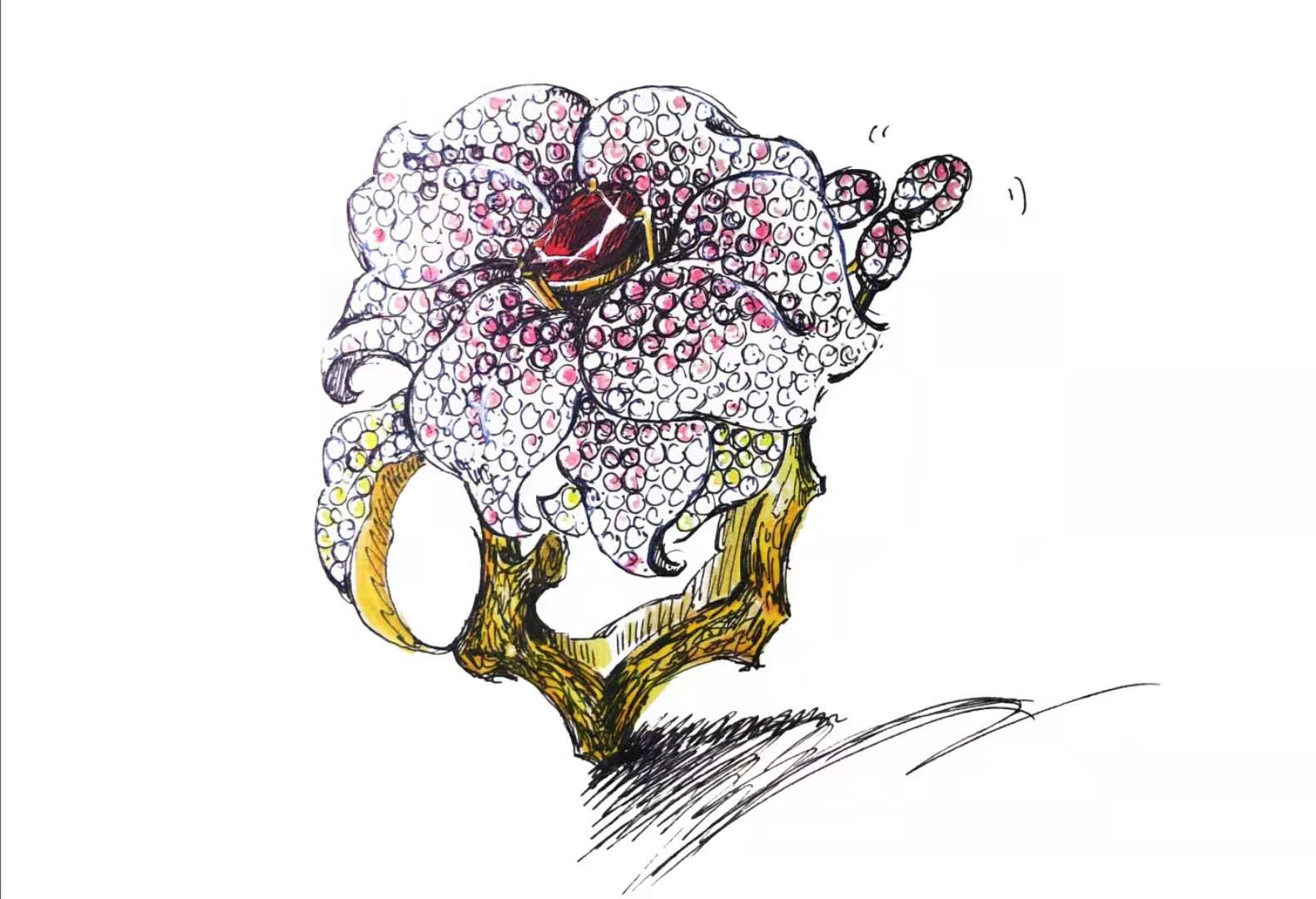 此款珠宝,曼妙花姿取其意,蕙质兰心如佳人。作品形态娇媚,含苞待放。花苞部分可以微微转动,灵巧无比。主宝部分可以拆卸更换,是一件集功能和趣味于一体的高级珠宝首饰。