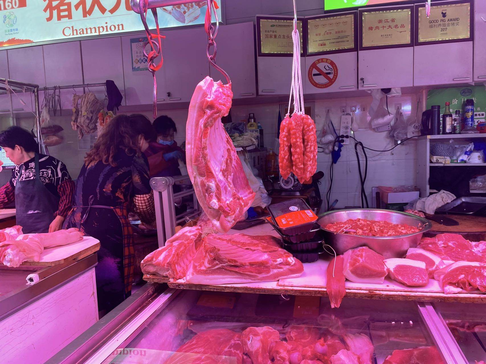 同样价格的肉在菜场里的价格是多少呢?我来到西康路上的跃康菜市场,同样部位的带排骨五花肉是35元一斤。我到摊位前的时候,店主阿姨正在灌香肠,价格45元一斤,阿姨说用的是太湖黑猪肉,所以会贵一些。