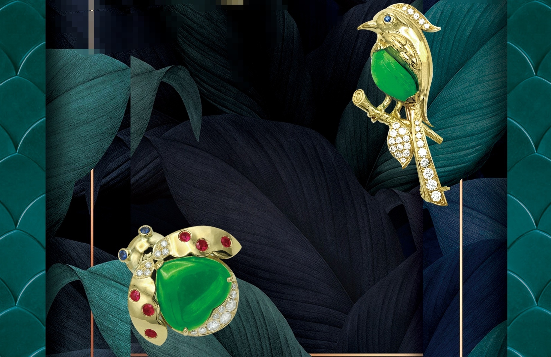 红、蓝、绿宝石的选用使瓢虫具有了蓝宝石的眼睛、圆润晶莹的绿色翡翠身体,镶嵌红宝石的金色外壳张翅欲飞,“宝石瓢虫”栩栩如生;而分别具有红蓝宝石眼睛、绿色翡翠身体的小鸟停驻在金色的树枝上,也十分生动别致。老凤祥设计师把自然界中这些鸟虫的生动、美好,通过翡翠、红蓝宝石、钻石等材质巧妙运用,打造出珠宝首饰,“飞”上了都市女性的衣饰上,十分精致有情趣。