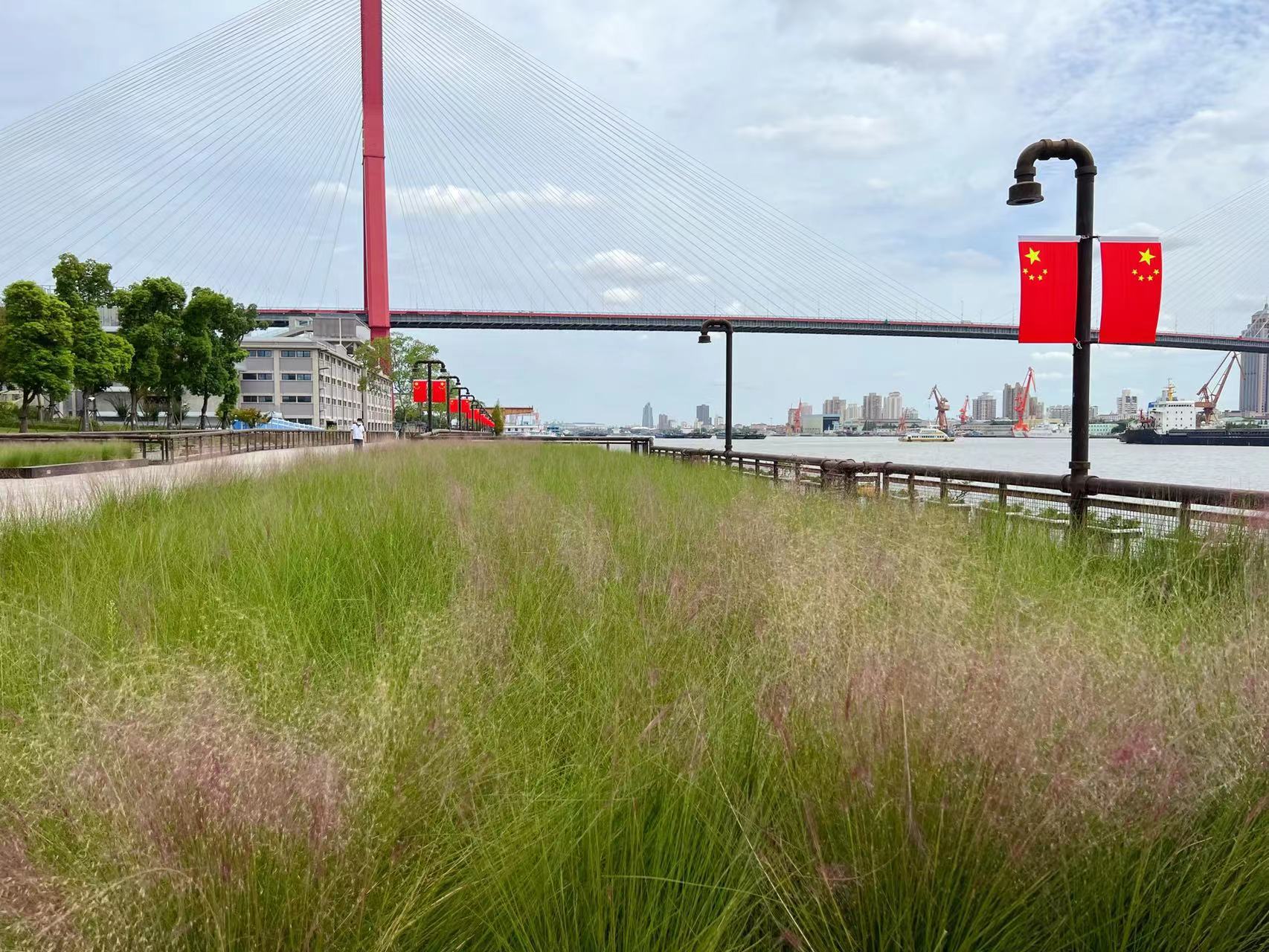 路过杨浦大桥,简约的红色线条横跨黄浦江,甚为壮观,在国旗的映衬下,更是夺目。白天万里无云的时候,用略仰的视角拍摄,将大桥与江水、城市建筑、桥下的粉黛乱子草、湛蓝天空相融,风光无限好,晚上景观灯一亮,又是另一番绚丽夺目。