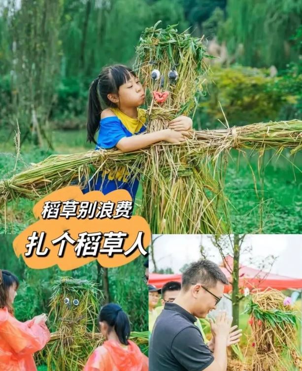 稻草别浪费,扎个憨憨的稻草人,再发挥想象装扮它一番、拍个合影。