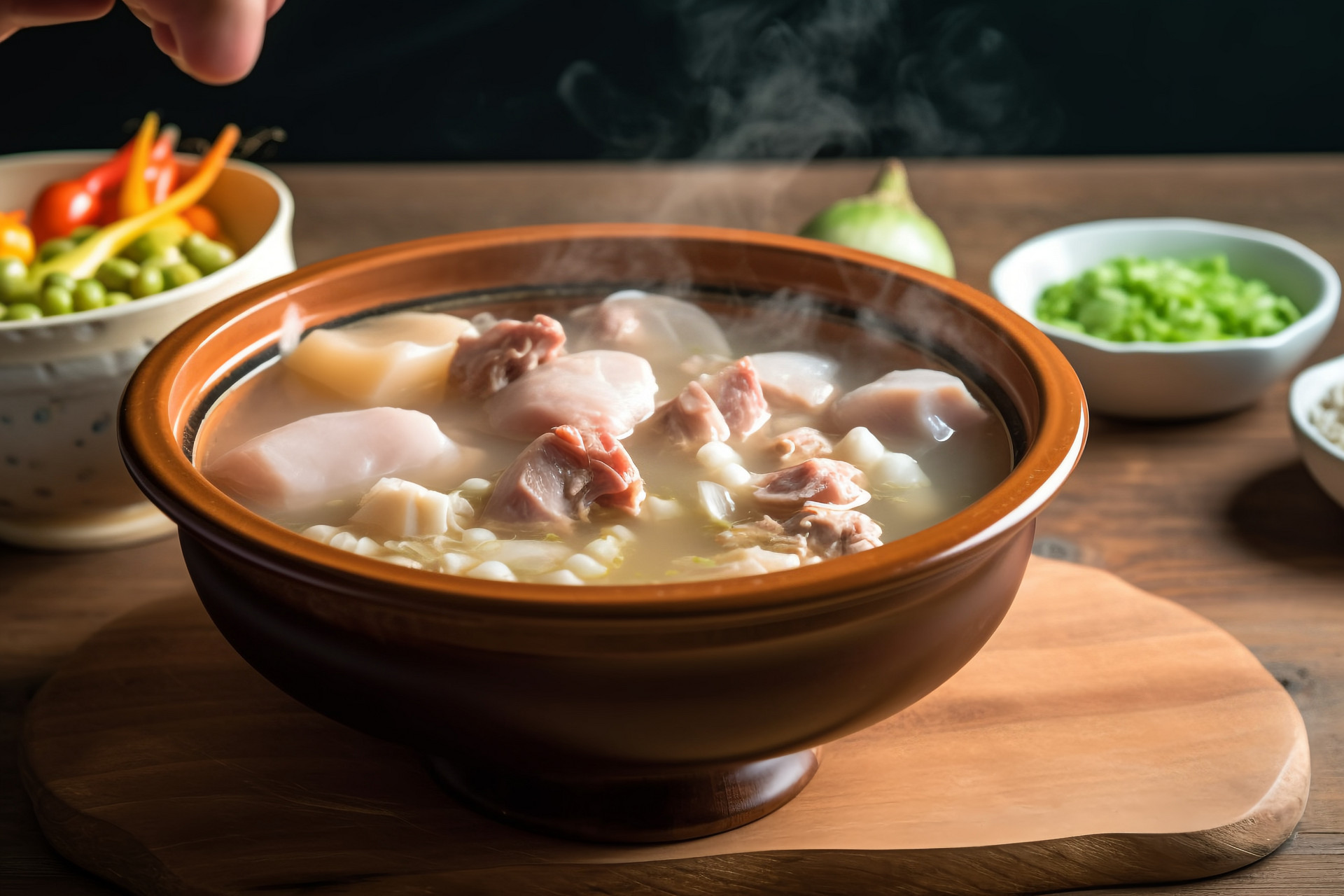 3.鸭肉入砂锅,添加没过的热水,添加葱和姜。