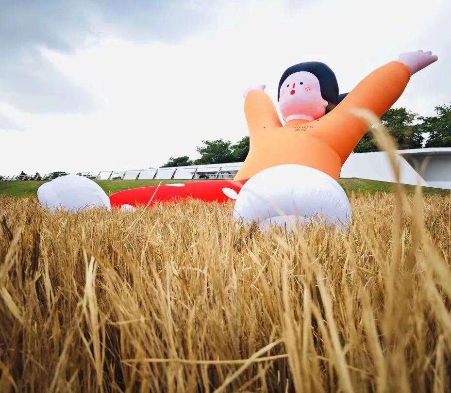 下腰女孩游躺在金黄的稻香里,张开双臂和稻?共同环抱风与光照,伸展的姿态投射出无限向上生长的生命力,作品寓意了“不知疲倦的丰收季节”,与万物共栖、共生。