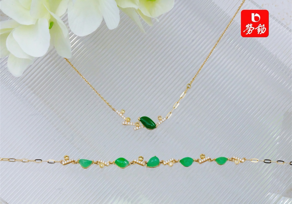 老凤祥计设计师想到了叶子形的绿色翡翠:金色的链条串起嫩芽色的多颗翡翠,好似绿柳枝刚抽出的嫩芽,这样精美细巧的手链戴在藕节般白嫩的手腕上,玉手纤纤柔若柳丝……举手投足尽显优雅秀丽。首饰挂件,单颗叶子形翡翠色泽浓绿,更能映衬出肤色白皙,日常穿搭配白衬衣清新优雅。