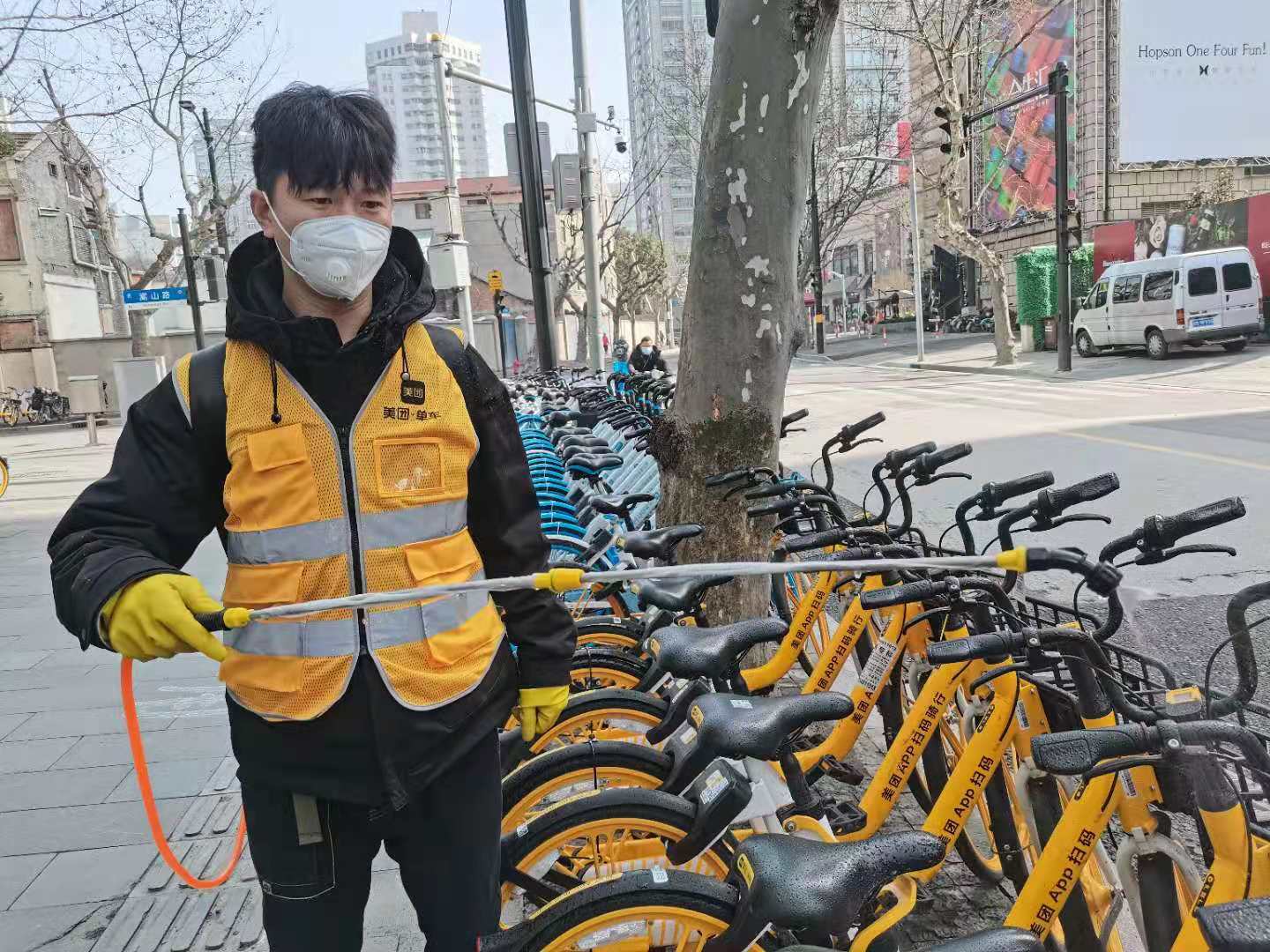 今年34岁的他,老家在大连,来上海已经十多年了。“我已经好几年没有回家了,本来打算今年早一点带着孩子回家,看看爸爸妈妈。不过考虑到今年的特殊情况,最后还是决定留在上海,在春节期间坚守岗位,我觉得也挺有意义的。”小王告诉记者,自己的工作是在街头做共享单车的无差别消毒,不分品牌,不分颜色,对负责区域内所有共享单车的车龙头、车篮、刹车把手、坐垫、锁扣等与市民接触部位进行重点喷洒消毒和擦拭,保证最安全的骑行环境。