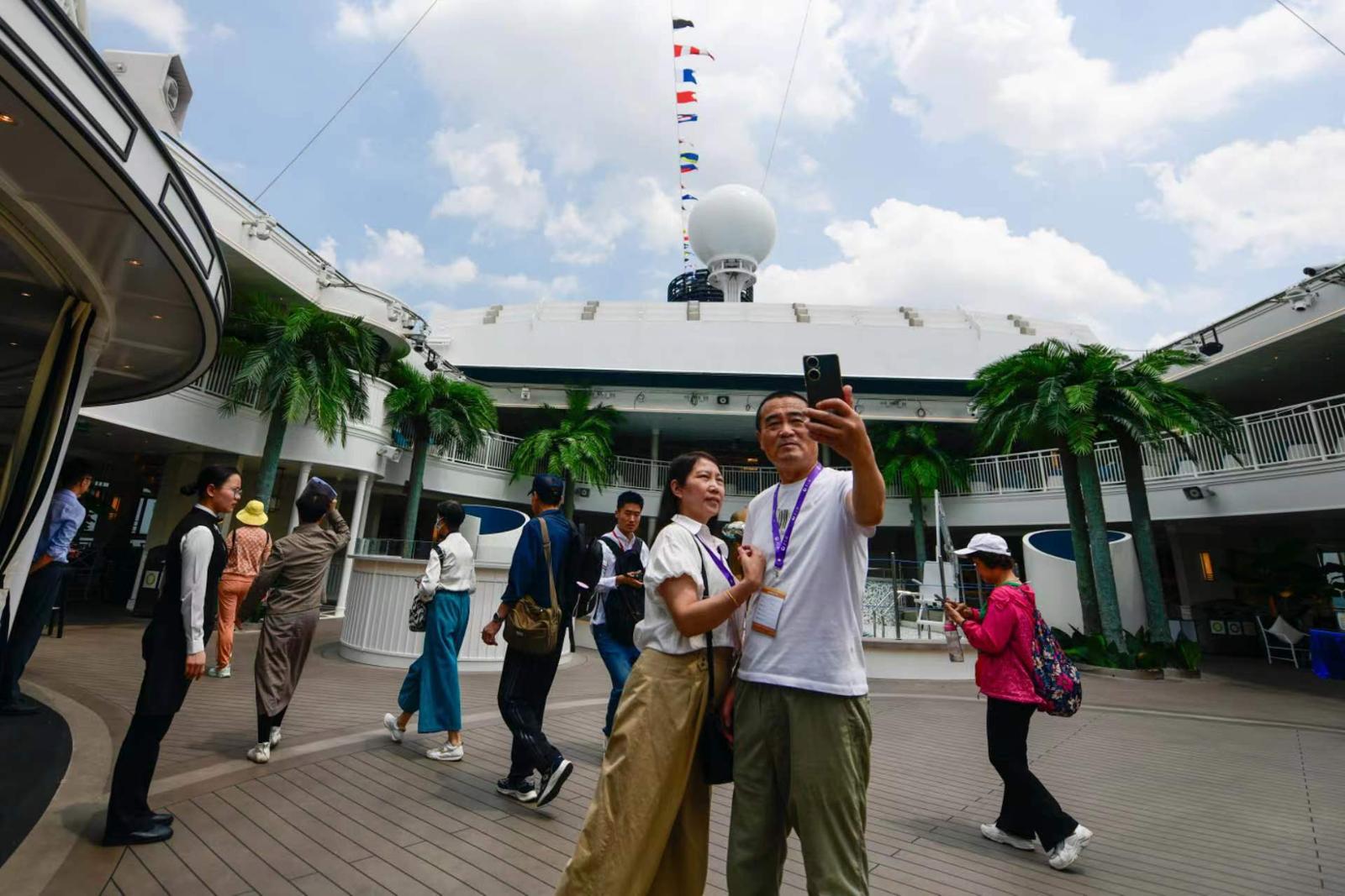 旅客通过邮轮甲板区域,自拍留影。劳动报记者 颜筱依 摄影