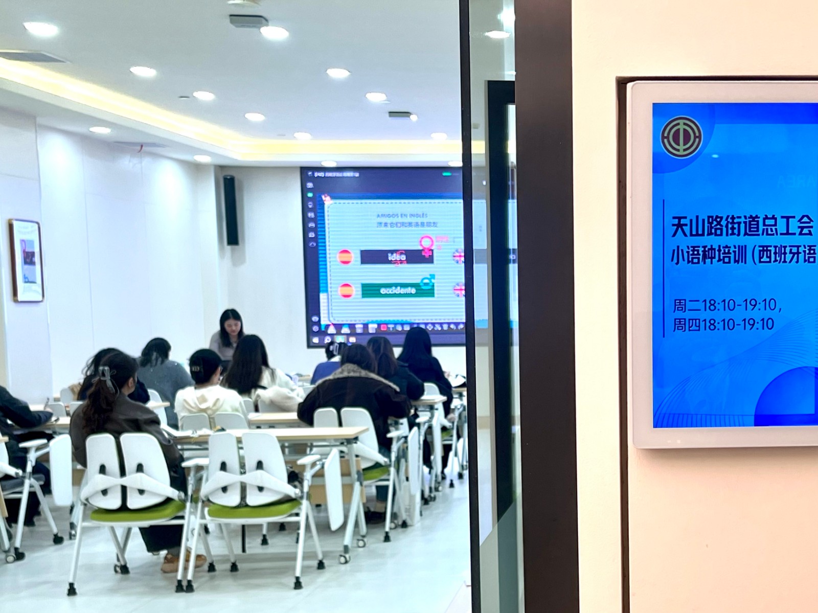 3月24日晚上6点不到,位于长宁区娄山关路500号,刚刚启用的天山商圈“荟新”人才服务驿站内人头攒动。虽还未到上课时间,但已有约20名来自附近7幢“亿元楼”企业的职工,在结束一天工作后,早早从公司来到教室,为即将开始的西班牙语课做准备。当天,是天山路街道总工会......