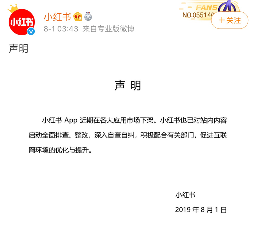 今日凌晨,小红书通过官方微博发布声明称,针对其App近期在各大应用市场下架,小红书已对站内内容启动全面排查、整改,深入自查自纠,积极配合有关部门。