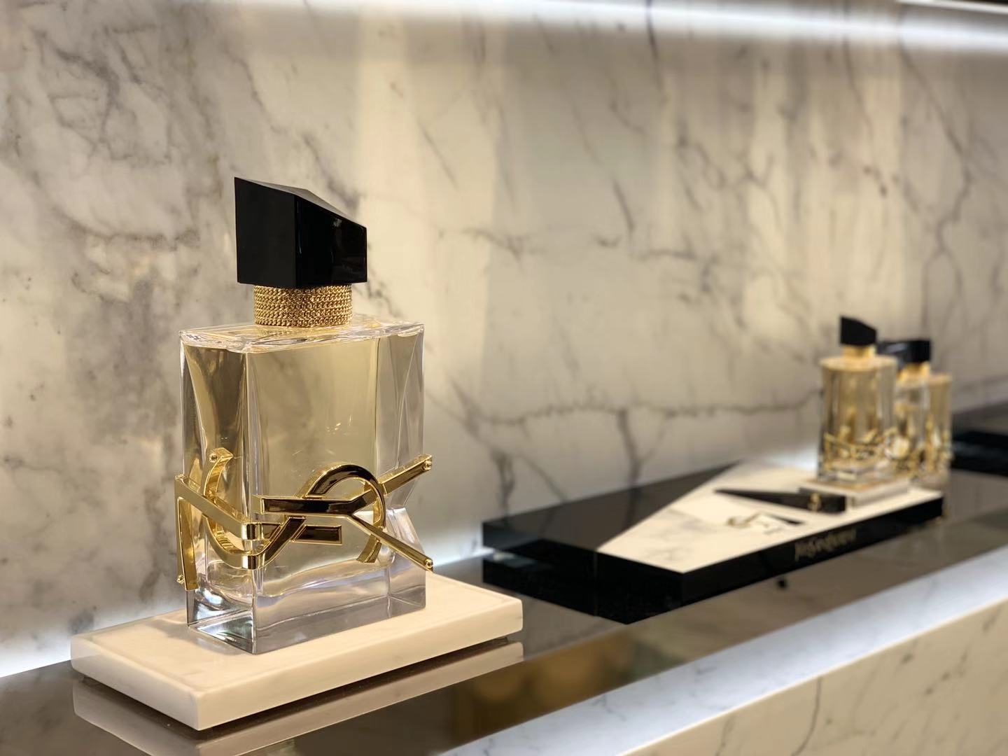 此外,YSL圣罗兰美妆新天地旗舰店的整体设计以黑白金为主色调,门店外墙大面积铺以黑绸纹大理石,内部的香水区背墙以雪花白大理石铺就。这种大面积使用大理石的店铺设计目前是YSL美妆全球店铺中的首家,也是独家。