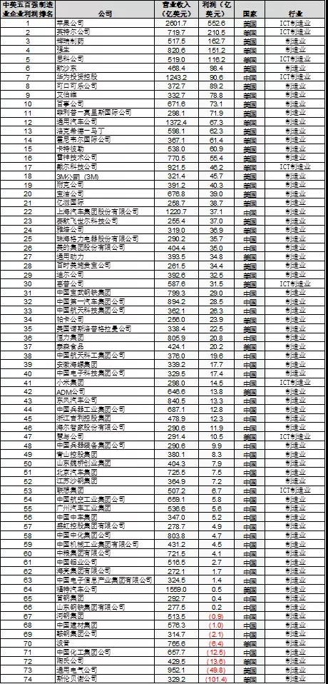 好了,接下来我们直接进行最终比较,那就是中美入选了世界五百强的制造业企业的利润比较,中美总共有74家制造业企业入选了世界五百强(包括ICT制造业)。