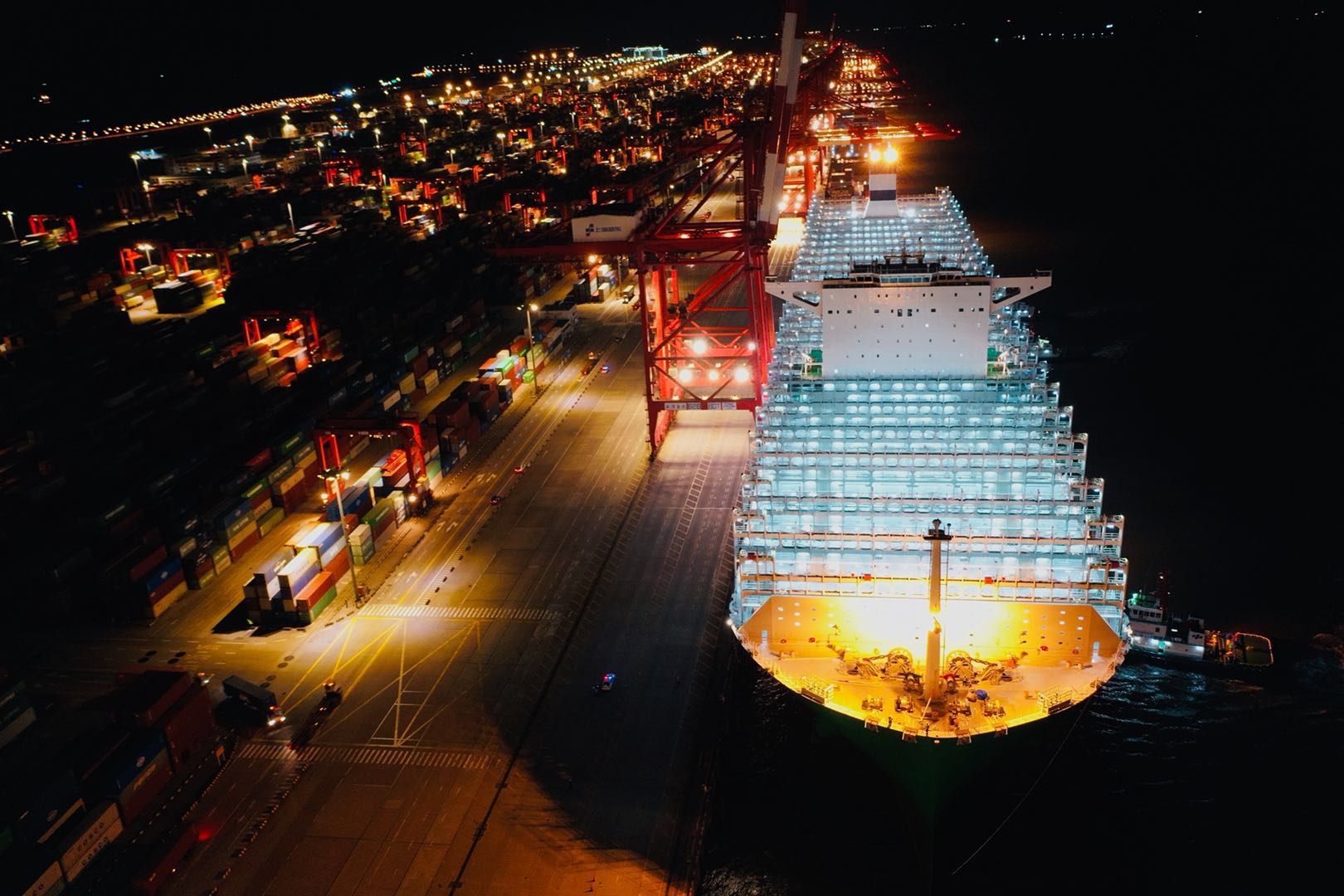 9月24日晚19时,全球首艘23000标箱级天然气动力集装箱船“达飞雅克·萨德”轮缓缓靠泊洋山港二期码头,正式投入运营。这个配载环保动力系统的“绿巨人”闪耀着中国“智”造的光芒,它将作为“一带一路” 倡议和繁荣贸易的使者,进一步优化中欧经贸联系,推进疫情后世界经济的“绿色复苏”。