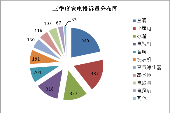 从消费内容来看,三季度上海家用电器售后服务问题较为突出。夏季是家电使用的高峰期,也是故障多发期。三季度,全市消保委共受理家用电器投诉2462件,空调、冰箱、电视机、洗衣机等传统家电投诉占到六成,其中空调投诉量最高。家电的质量、售后服务问题仍是投诉焦点,比如机器无法启动、有裂缝、故障屡修不好、维修收费不合理等。洗碗机、扫地机器人、养生壶、料理机等智能小家电迅速走俏的同时,亦引发诸多投诉。问题主要集中在机器无法启动、不具备广告宣称的使用功能、故障易发且无法准确排除等。