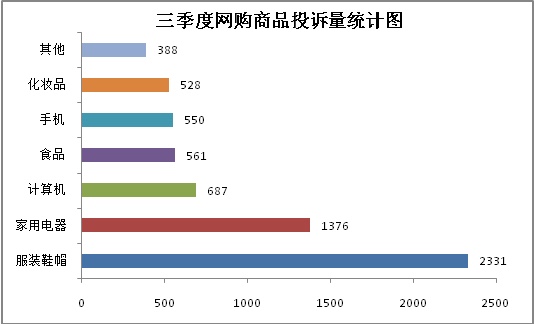 三季度,网络购物仍是消费者投诉热点,全市消保委共受理网购商品投诉6033件,其中涉及服装鞋帽、家电、计算机、手机、食品和化妆品的投诉较多。问题主要集中在商品质量瑕疵、货不对板、夸大性能、与宣传承诺不符、退换货不及时等。