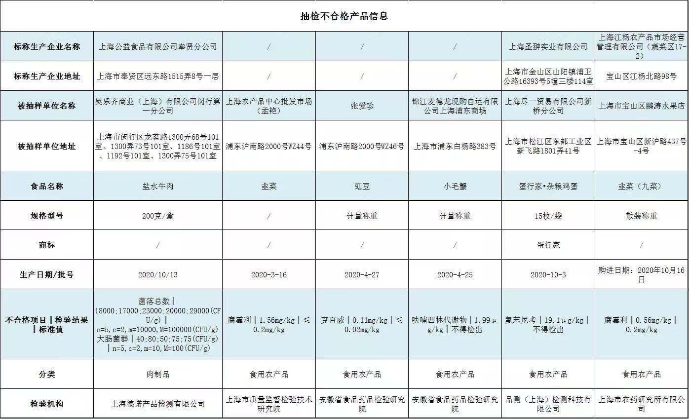 12月10日,上海市市场监管局公布食品抽检结果。据悉,上海市场监管部门对粮食加工品,食用油、油脂及其制品,肉制品,乳制品,食用农产品等21大类1658批次食品开展食品安全抽检。其中6批次不合格,涉及盐水牛肉、韭菜、豇豆、小毛蟹、鸡蛋。不合格项目包括菌落总数、大肠菌群、腐霉利、克百威、呋喃西林代谢物、氟苯尼考。