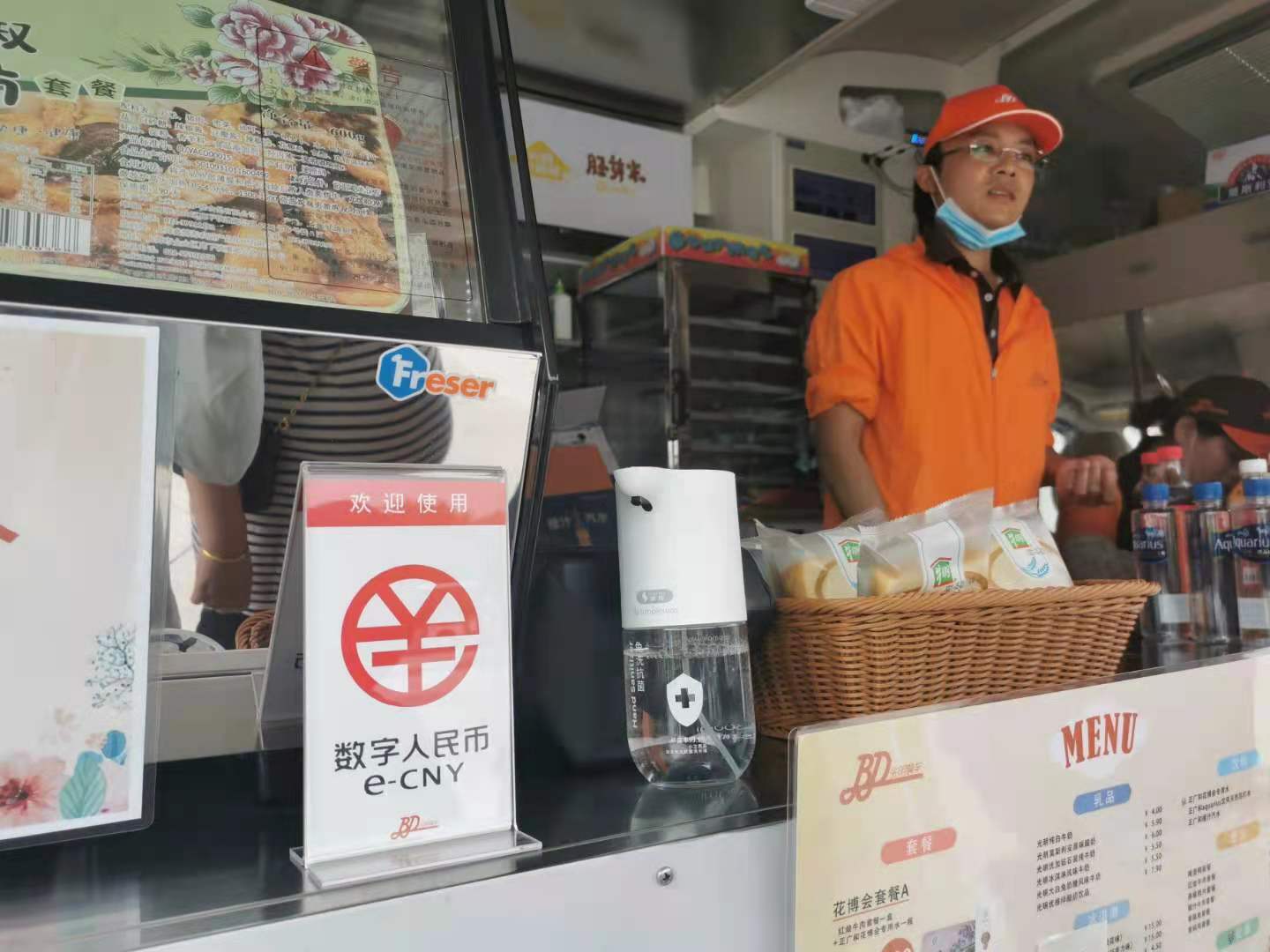 在园区世纪馆门口,有多个光明餐车,每个餐车上都放着数字人民币标识。“有游客会使用数字人民币消费,也挺方便的,来试试吧!”服务人员笑着说。