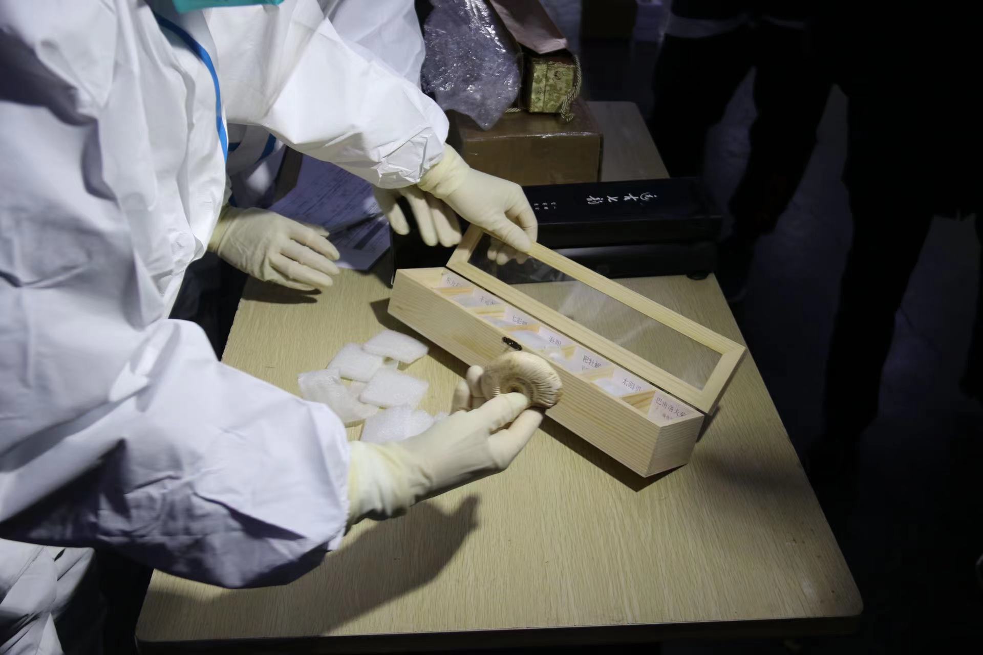 2月11日,记者从上海海关获悉,近日,浦东机场海关在对出口快件实施监管时,一批次申报品名为“装饰品塑料树脂”的快件引起了现场关员的注意。实际货物为单木箱包装,重量较申报的1.5KG较重,经彻底开箱后发现,木箱内部被分隔成7个隔间,每个隔间均放置1块石状物品,同时还附带“太阳贝 晚白垩纪”、“海胆 奥陶纪”等字样的标识,包装较为精致。