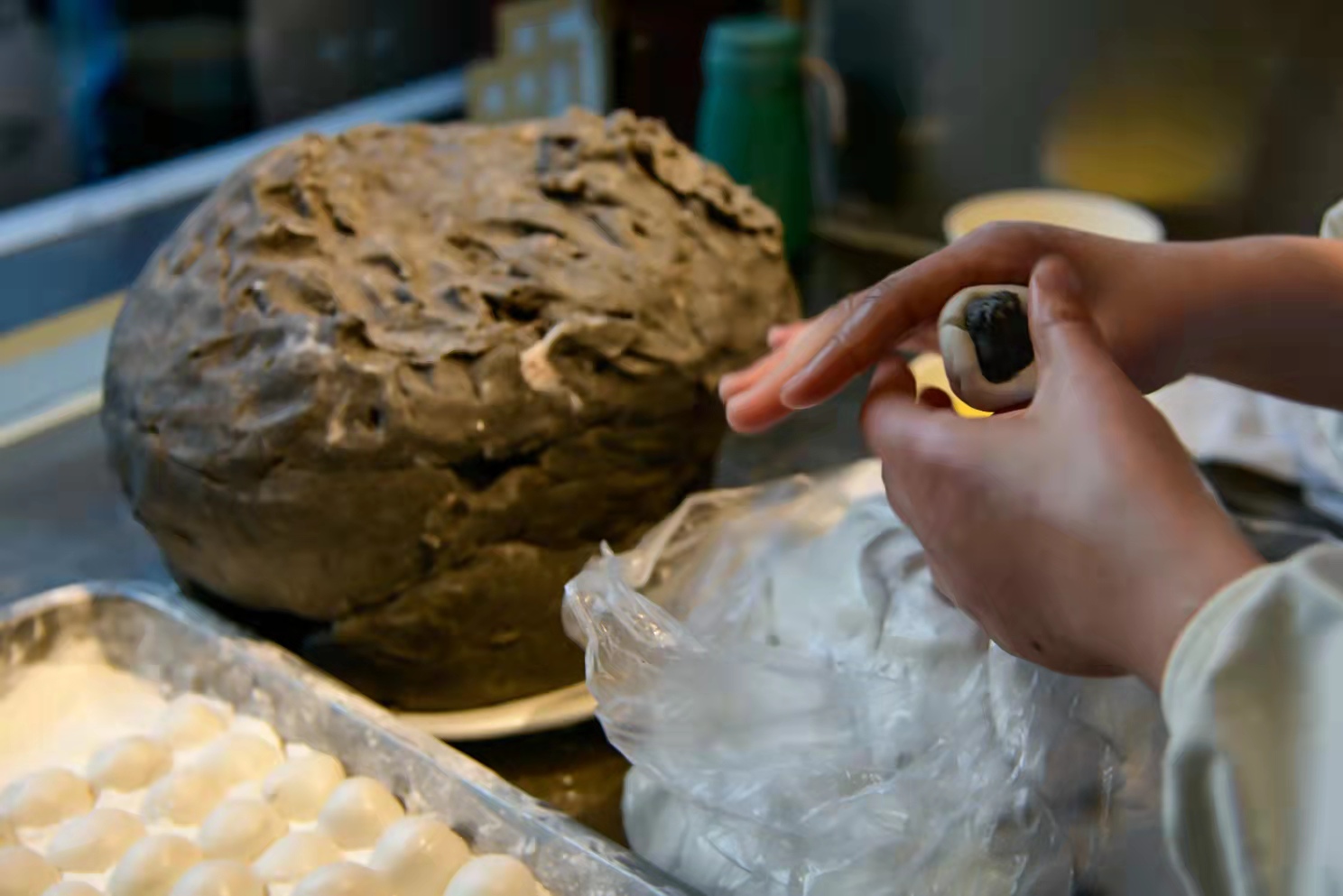 “馅芯刚刚好在正中,一口咬下去,甜口黑洋酥一嚼一嘴油香,咸鲜口的汤汁浓郁,鲜香扑入口中,滋味顶呱呱。”徐正留说。不似汤包小笼要打十八道褶的技艺,汤团需要恰到好处的比例和精准的将馅芯填入面皮中。面皮、馅芯都是手上拿捏,迅速搓圆,平均5秒钟一个成型。
