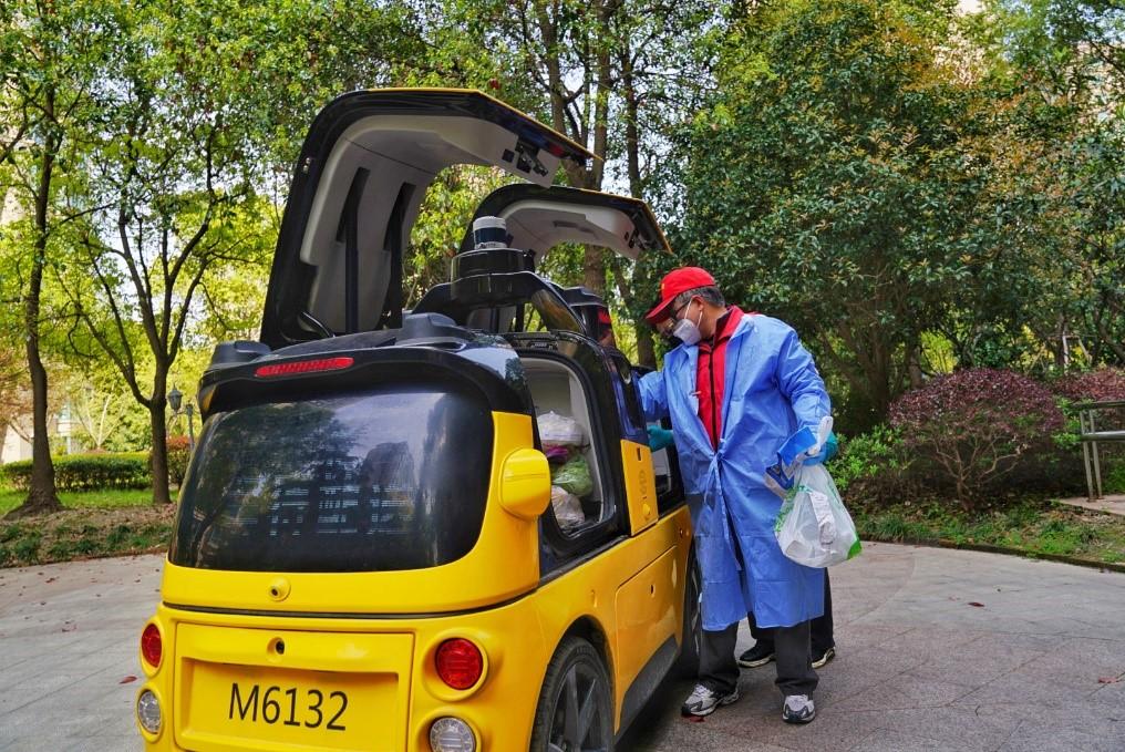记者了解到,站点工作人员会先将订单放入车厢内,在车门关闭后,车辆将自主行驶至社区内用户单元楼下,由驻守在楼下的志愿者从车内取出,“每完成一次配送后,我们都会及时对车内外进行全面消毒,减少隐患。”