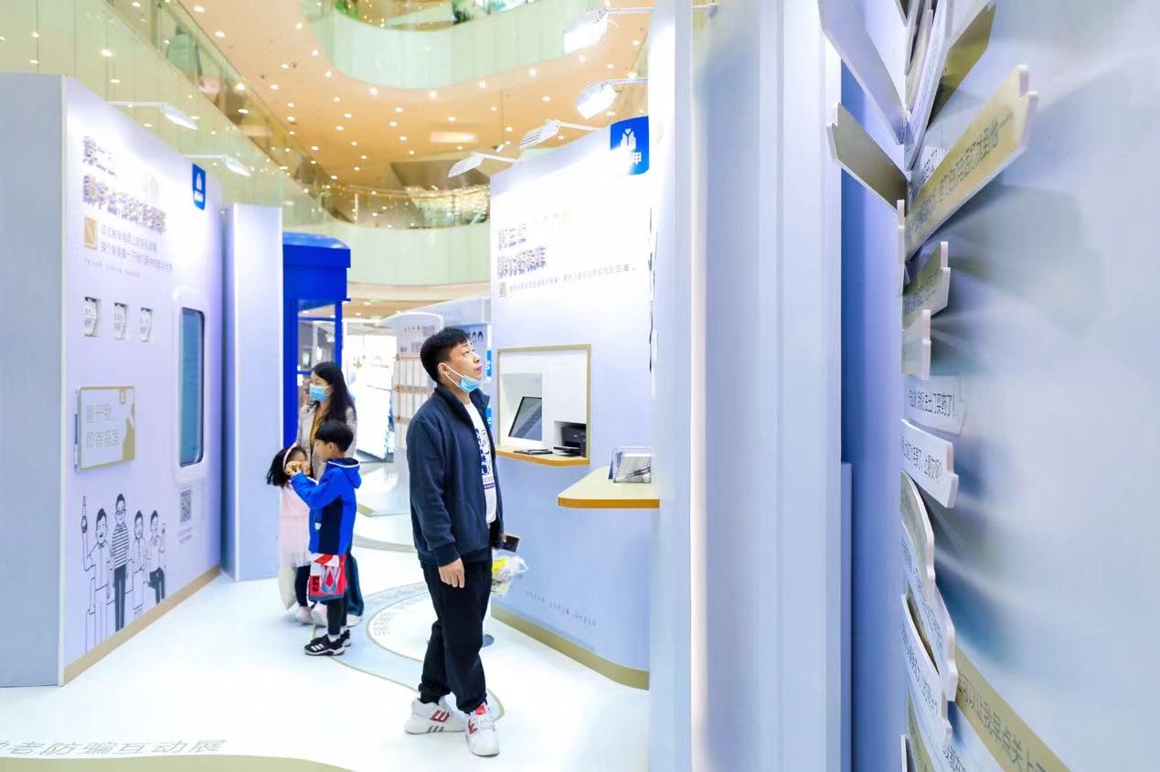 12月9日上午,在静安大融城,蓝马甲公益行动专门为上海老年人举办了一场反诈助老展览。记者看到,展区看上去像一叠叠书卷,翻开的页面上展示了老年人从日常生活到手机使用的困惑。