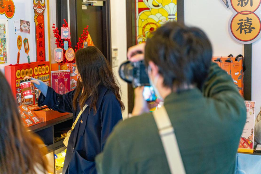 笔者在活动现场看到,该迎春驿站不仅有别具江南年味的布置,更有“长相思”“知府有礼”“入画江南”等趣味互动板块,吸引了许多市民驻足。在这里,市民可以领取限定明信片留下祝福和寄语,也可以通过完成互动任务获得《江南百景图》限定主题礼品、主题饮品等,“玉兔呈祥”新年礼盒等周边也在限量发售。