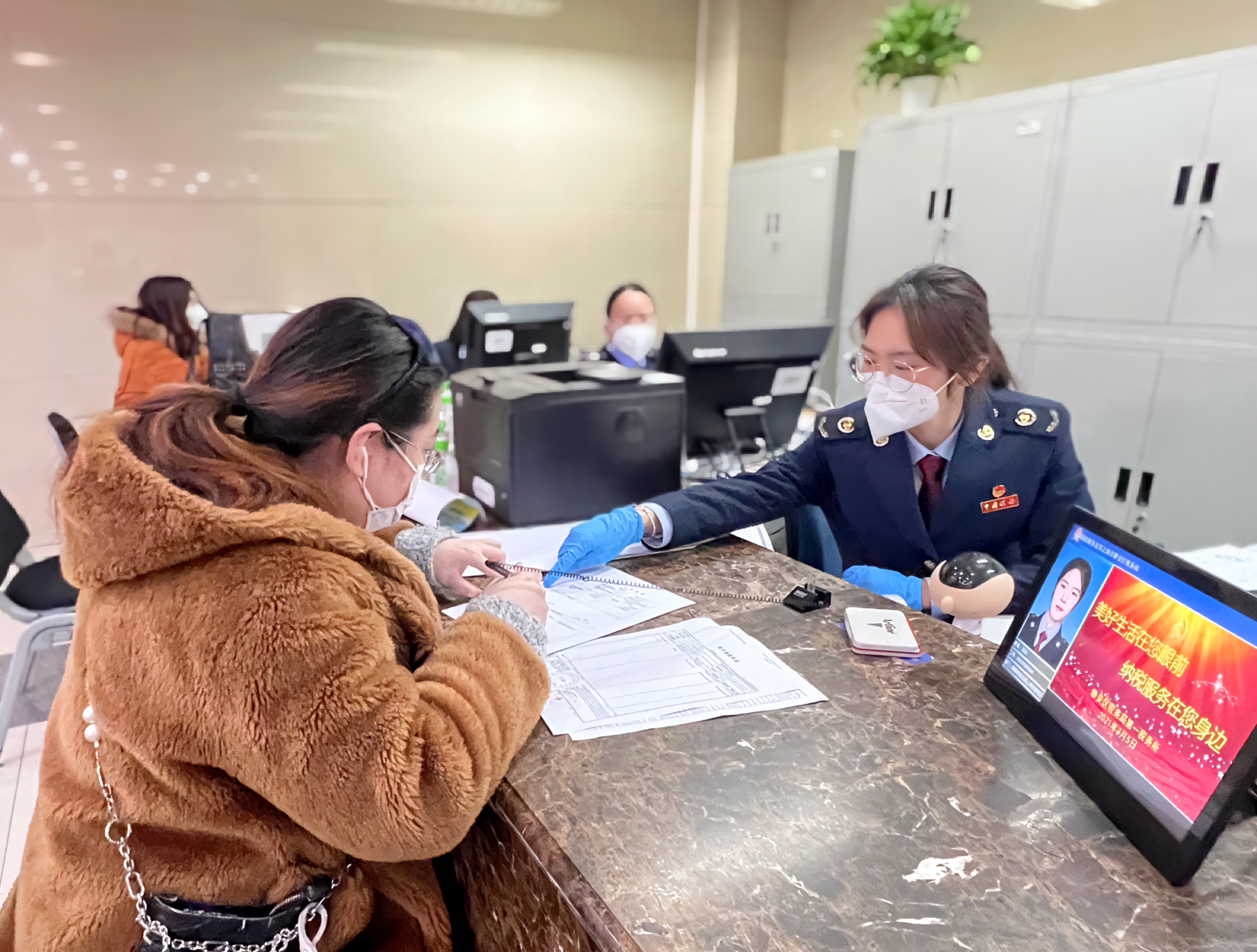 (税务干部佩戴N95口罩和手套为纳税人办理业务。)