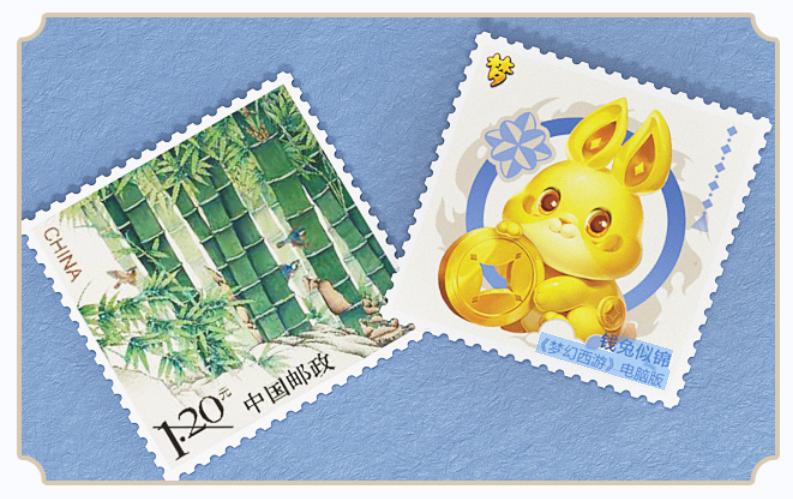 笔者看到,本次联动推出的《梦幻西游》兔年纪念个性化邮票使用兔子与竹子作为主要元素。竹谐音“祝”,有祝福之意,竹子一节节的枝干被赋予了节节高升的寓意,在展现新年氛围的同时也将吉祥如意的美好祝福镌刻其中。