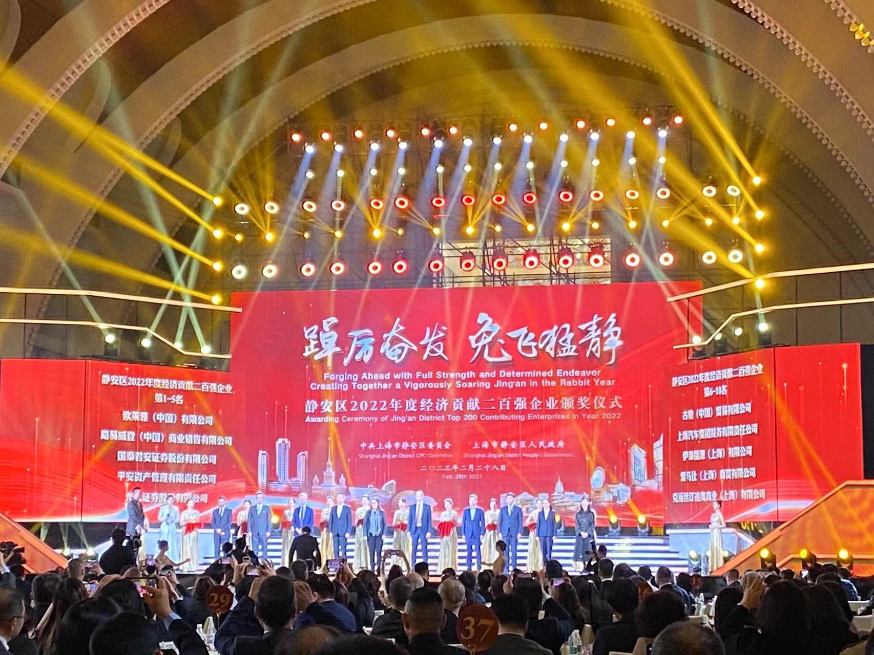 2月28日,静安区2022年度经济贡献二百强企业颁奖仪式在上海展览中心举行。欧莱雅(中国)有限公司、路易威登(中国)商业销售有限公司以及国泰君安证券股份有限公司分列二百强企业前三名。