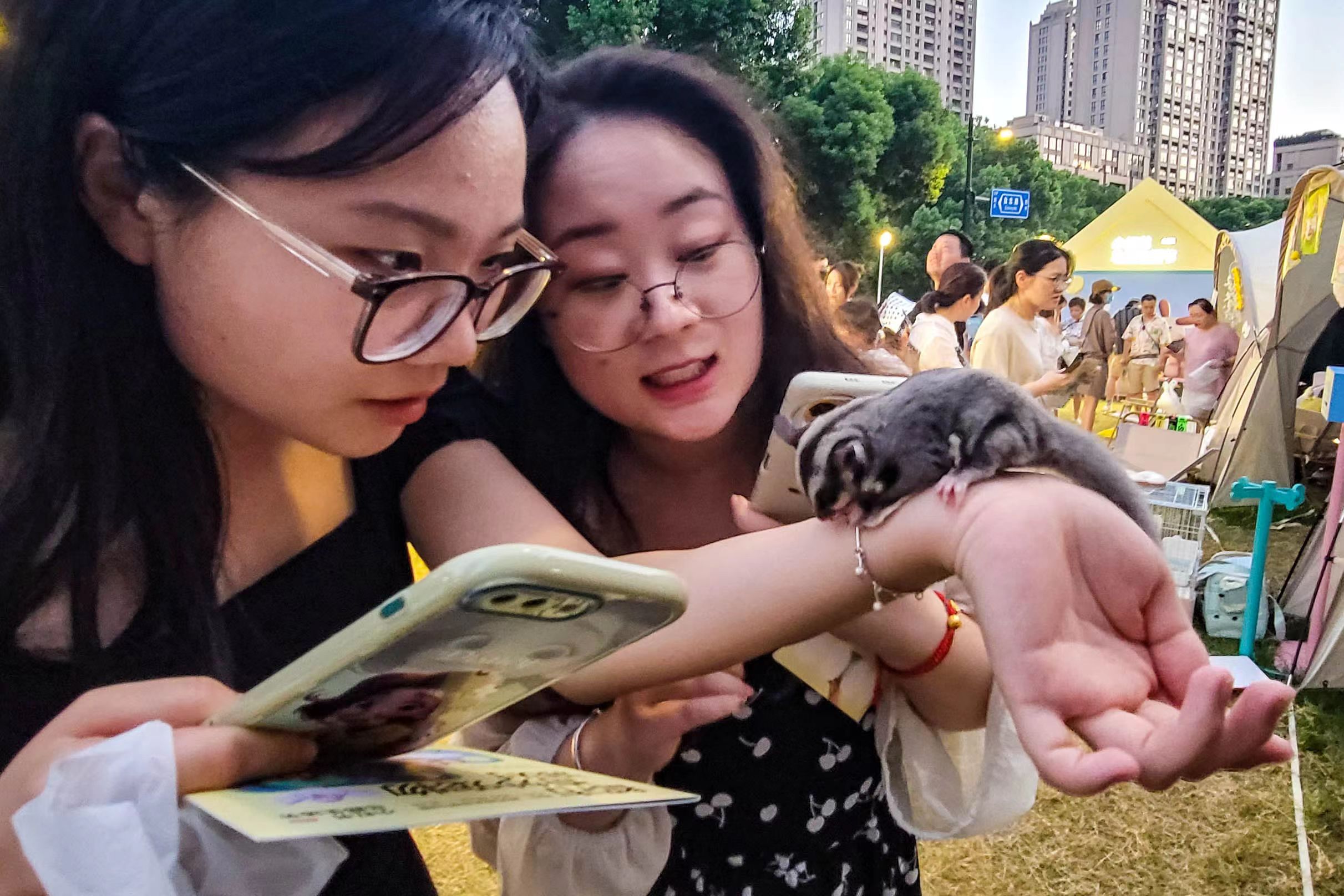 图为异宠爱好者与蜜袋鼯互动。劳动报颜筱依 摄