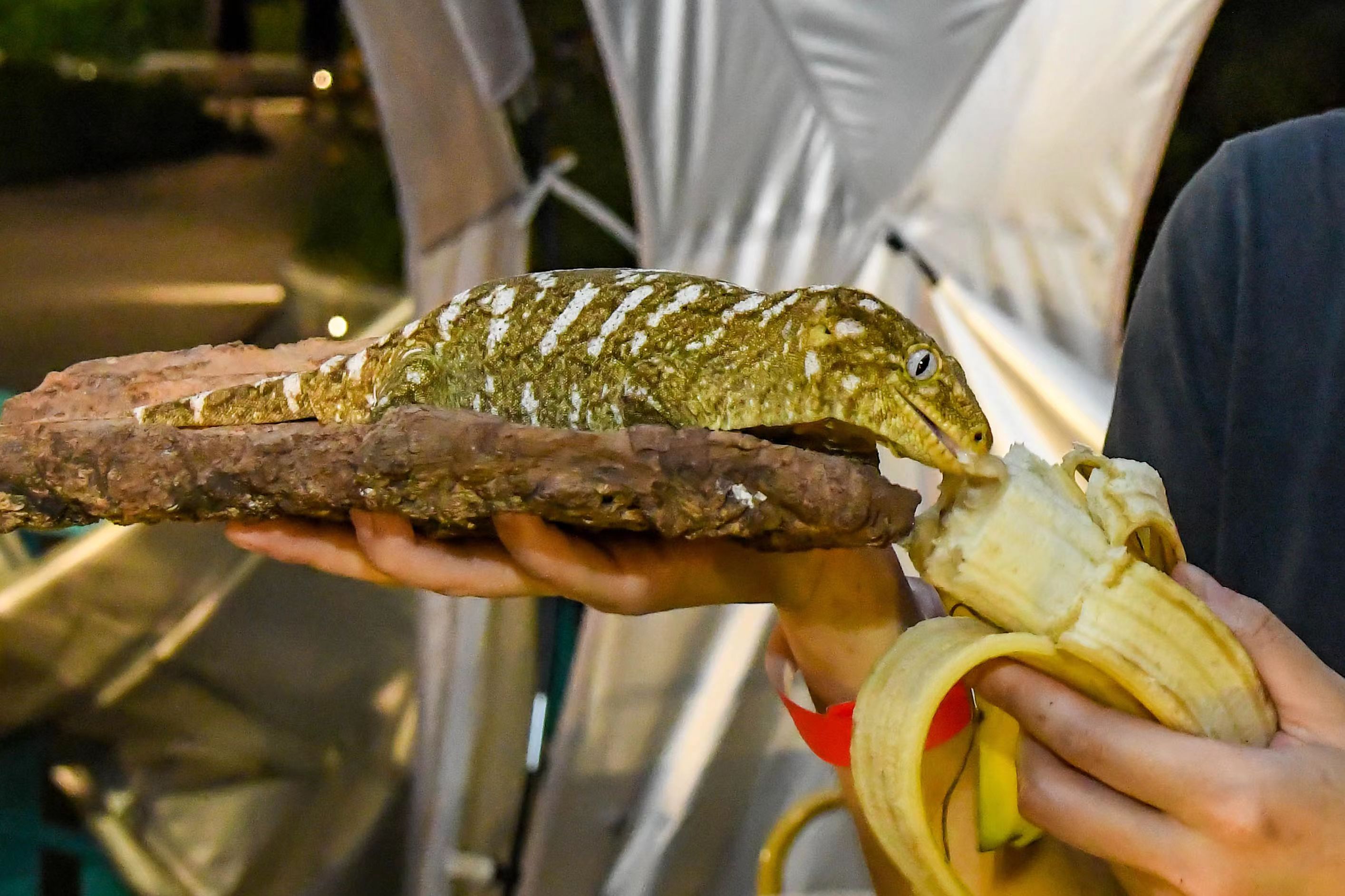 宠物主正在喂鬃狮蜥吃香蕉。劳动报颜筱依 摄