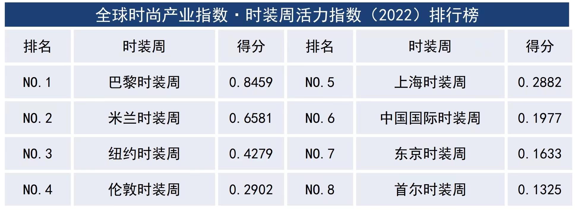 全球时尚产业指数·时装周活力指数(2022)排行榜。上海时装周图