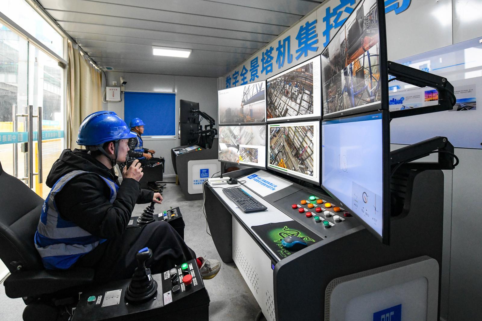 头图为塔吊司机在地面上的数字全景塔机集控驾驶舱内操作工地上的塔吊。劳动报记者颜筱依 摄影