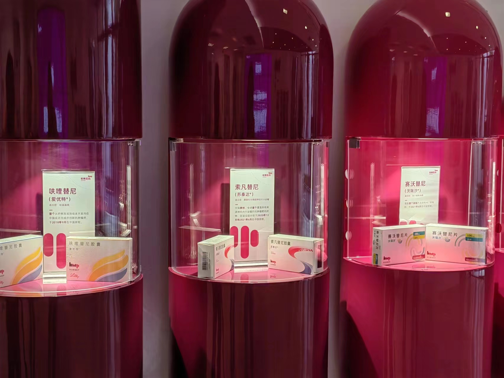 一走进和黄医药,首先映入眼帘的就是几个胶囊型展台中的药盒。小小药盒背后是超17亿美元的研发投入。“业内常说创新药的研发需要10年、10亿美元的投入,而现在已经进入了需要15年、15个亿的投入才能够产出一款创新药的新阶段。”作为首批入驻浦东张江的本土创新药企,20多年来,和黄医药已有13个自主创新药物进入全球临床研究阶段,呋喹替尼、索凡替尼、赛沃替尼三个1类创新药已在国内获批上市,并相继进入上海市创新产品、新优药械等重点目录。其中,最引人瞩目的就是呋喹替尼。