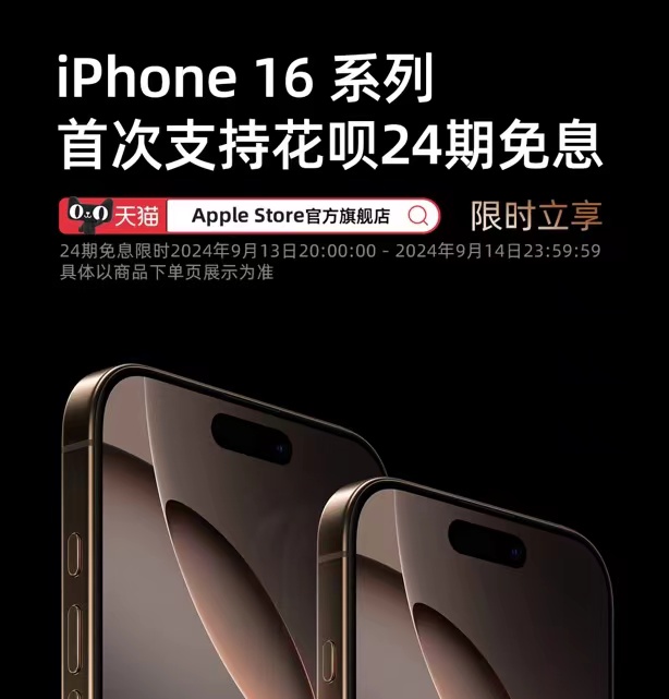 9月10日,作为苹果唯一电商平台官方旗舰店的天猫Apple Store 官方旗舰店,宣布将在9月13日晚8点,现货预售iPhone 16系列,领先其它电商平台7天,与苹果官网共享库存、享受与官网同等的售后服务。同时,今年天猫Apple Store 官方旗舰店首次支持iPhone16全系24期分期免息。